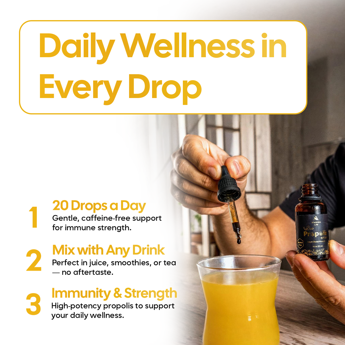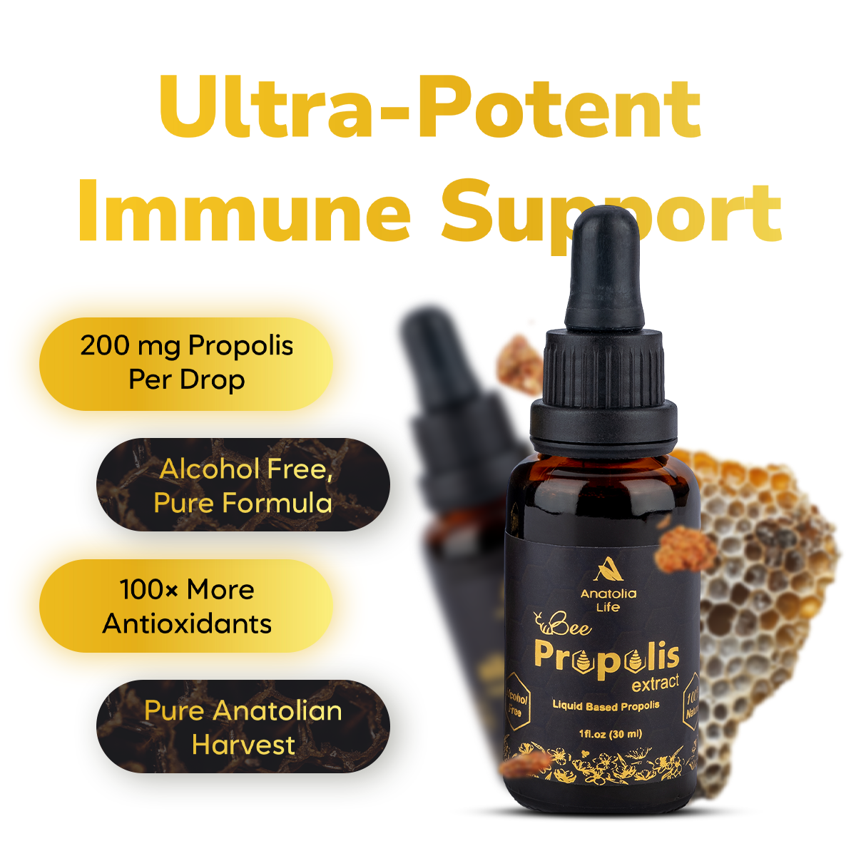 - SAF ARI PROPOLİS EKSTRAKTI – Sıvı formda konsantre arı propolisi tentürü, her damlasında bağışıklık savunmasını güçlendirmek ve günlük sağlığı desteklemek için 200 mg temel destek içerir.