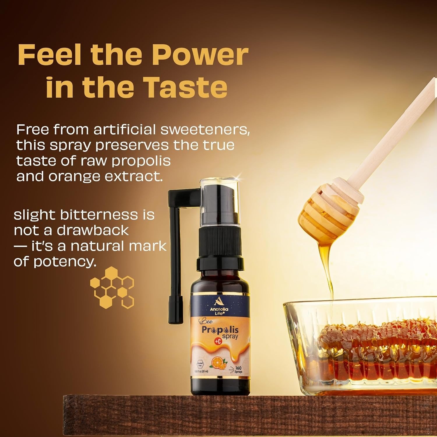 - A Natural Bitterness – A Sign of Pure Ingredients Our propolis spray has a naturally bitter taste—because we never add artificial sweeteners or masking agents. Just like trusted medicines that may taste unpleasant but serve a purpose, the slight bitterness here is a sign of raw propolis and real vitamin C from orange extract. We chose purity over artificiality—your health deserves nothing less.