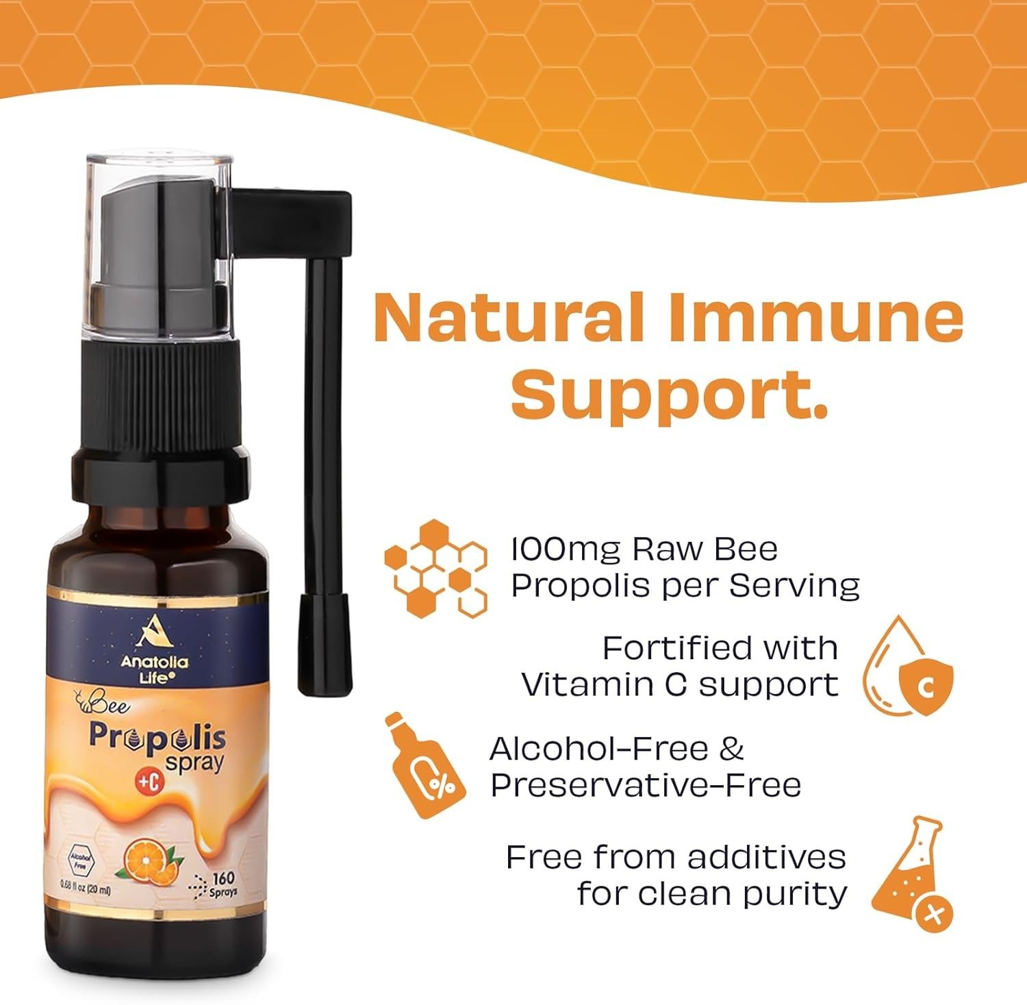 - 100% Natural & Alcohol-Free Formula Crafted with purified water, raw propolis, and natural orange flavor—this spray is free from alcohol, preservatives, sweeteners, and artificial additives. A clean and conscious choice for your body.
